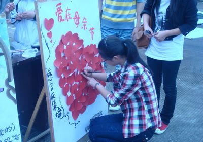 学院团学会向同学们发出倡议,在母亲节为妈妈做五件事:制作“妈妈档案”,给妈妈打一个电话或者发一条短信,跟妈妈说一句“我爱你”,给妈妈唱一首歌,送妈妈一份小礼物;完成了五项任务的同学在写有“Mom, I Love You”的横幅上缝制一颗代表爱与亲情的纽扣,感受妈妈为自己缝衣服的辛劳,体会 “慈母手中线”的温馨。活动甚至还吸引了不少小朋友的加入。