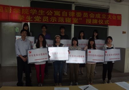 5月9日中午,外国语学院在A5教室举行学生公寓自律委员会成立大会暨“学生党员示范寝室”授牌仪式。学院党总支书记赵校民、总支副书记郑丽君和辅导员出席,学院相关寝室寝室长、党员代表180多人参加。