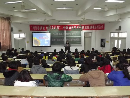 为进一步加强学风建设,引导广大学生立德成才,12月13下午,外国语学院在A1大教室举办“树青春旗帜、创优良学风”学风建设先进事迹报告会。学院党总支书记赵校民、副书记郑丽君,各年级辅导员出席报告会,学生党支部支委、团学会干部及各班代表220多人参加会议。
