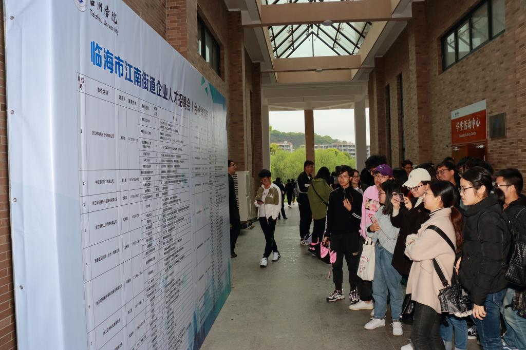 4月11日下午,临海市江南街道企业人才招聘会在台州学院椒江校区举行。铁马科技、海宏液压、中联重机、四通制管等26家企业带着85个岗位,广揽人才。台州学院学工部部长张梅芬代表学校向参加会议的领导和企业家表示欢迎。江南街道办事处主任徐世贤介绍了江南街道的基本情况。航空工程学院党总支委员董立达、江南街道副主任金颖斐参加活动,学工部副部长马斌主持。