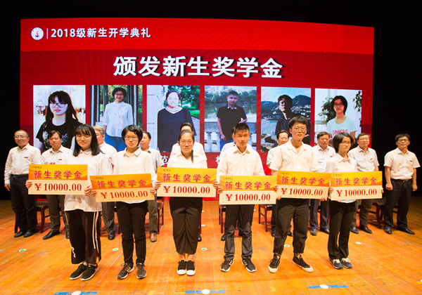 典礼在雄壮的国歌声中正式开始。随后,校领导为2018级的蔡雨璋、陈可心、陈佳敏等18位新生奖学金获得者颁奖。这18位新生奖学金获得者是根据学校《台州学院新生奖学金评定发放办法》评选产生,其高考成绩高出当地全国普通高校招生第一段录取分数线5分及以上,每人获得一万元的奖励。