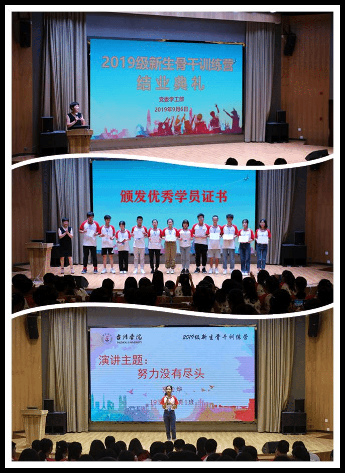 2019,台院有我。愿2019级新生骨干们在今后的学习生活中,再接再厉,努力成为具有“忠诚、奉献、进取、合作”特质的人才,为台州学院注入新的活力,与台州学院共成长、同发展!