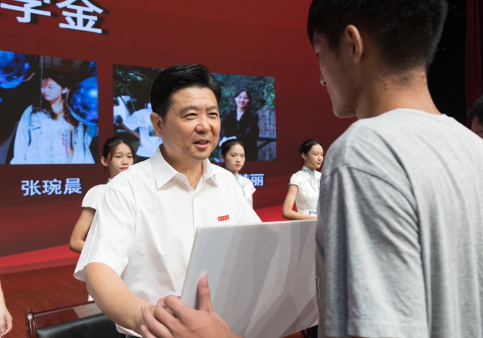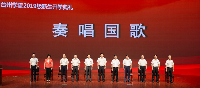 典礼在雄壮的国歌声中正式开始。随后,校领导为2019级的何元勇、单泓斌、华玉慧等12位新生奖学金获得者颁奖。这12位新生奖学金获得者是根据学校《台州学院新生奖学金评定发放办法》评选产生,其高考成绩高出当地全国普通高校招生第一段录取分数线5分及以上,每人获得一万元的奖励。