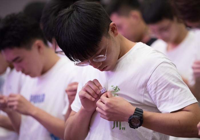 伴随着铿锵有力的校歌声,校领导为2019级新生代表佩戴校徽,其他新生全体起立,为自己佩戴校徽。戴上了沉甸甸的校徽,标志着所有2019级新生正式成为了台州学院的一名学生。