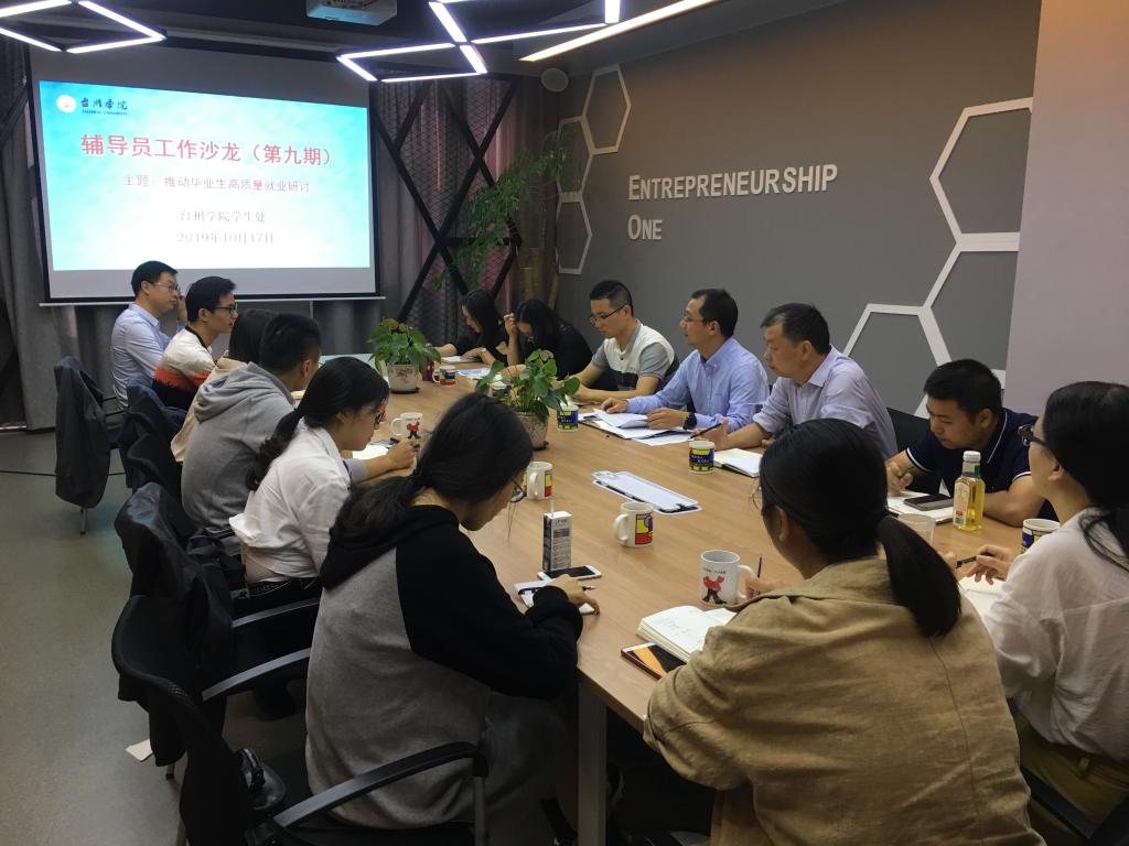 为高效开展2020届毕业生就业工作,10月17日上午,以“推动毕业生高质量就业”为主题的辅导员工作沙龙第九期活动在椒江校区大学生创业园举行,会议由学工部副部长马斌主持,各二级学院相关辅导员参加。