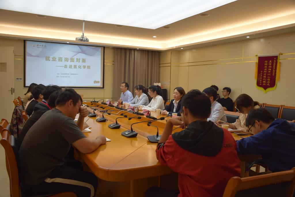 为进一步了解毕业班同学的就业心态,帮助解决同学们的就业困惑,10月17日晚,校学生处(就业服务中心)在医化学院301会议室举行了就业咨询面对面走进医化学院活动,百威集团台州人事、宁波银行信用卡中心销售高级经理周海平、我校2019届毕业生、宁波银行管培生毛征巧,学生处(就业服务中心)副处长马斌、医化学院辅导员娄柳柳参加咨询会。