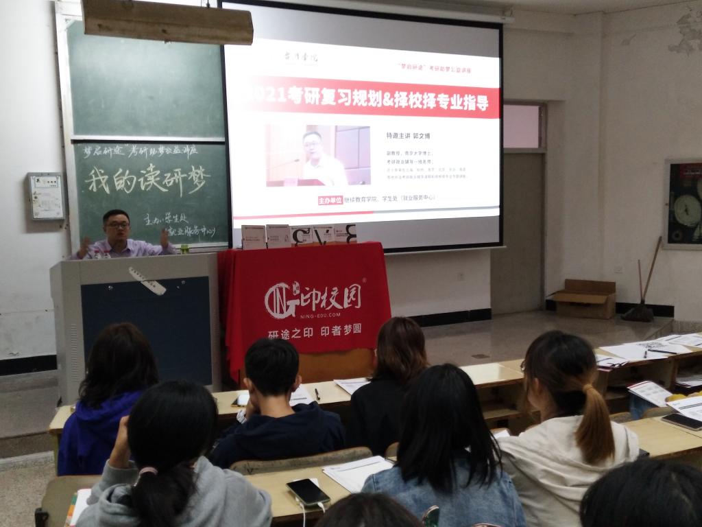 10月27日上午,“2021年考研复习规划、择校择专业”指导讲座在临海校区和椒江校区同时举行。南京大学博士、考研政治辅导名师郭文博副教授应邀主讲,学生处(就业服务中心)副处长马斌主持,两校区共400余名同学参加此次活动。