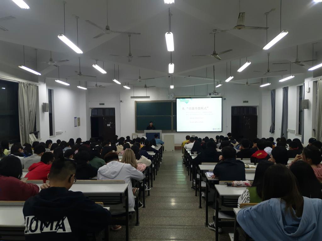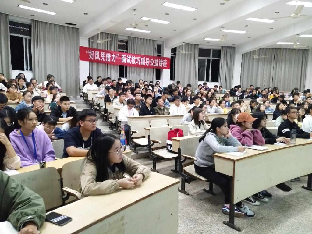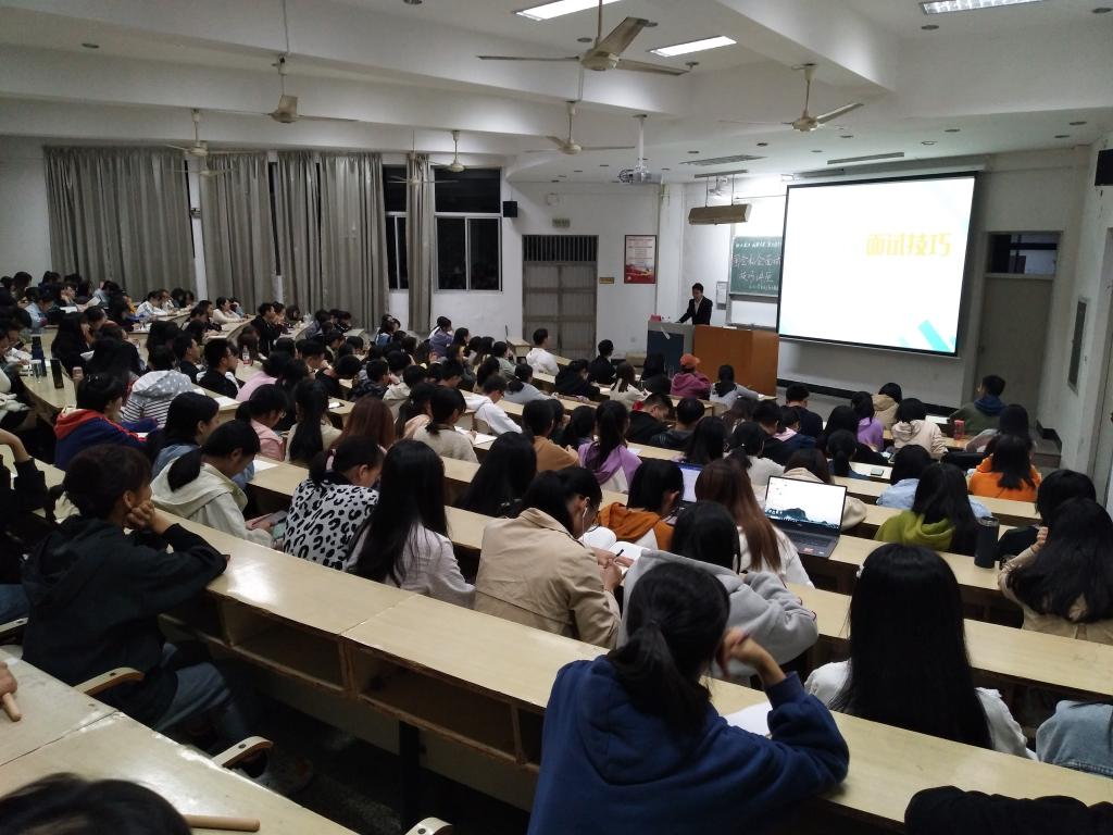讲座伊始,主讲人对目前就业形势做了简单分析,然后直入正题,点明面试对于个人发展的重要性,开始向同学们讲解面试实用技巧。随后,以国企、私企招聘中的部分真题为例,教同学们如何抓住面试题的核心,如何用发散思维解剖面试题目。典型有趣的例子加之老师的生动讲解,引得同学们在发笑的同时也赞叹讲座干货满满。主讲老师还告诉同学们,求职时要想脱颖而出,除了应当具备专业知识和专业能力外,还应当具有良好的心理素质和一定的求职技巧。最后,主讲老师强调,面试考验是主要是思维能力及见识面的广度,注重平时的思维训练才是王道。