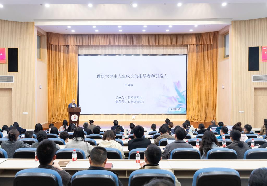 曲建武指出,辅导员在日常工作中要加强理论学习和业务提升,积累经验感悟,明确自身职业化专业化发展路径;要学会“自己教育自己”,朝榜样看齐,向先进学习,把为党育人、为国育才的初心使命转化为立德树人的真实行动;要以情感人,脚踏实地为学生的健康成长和未来躬身力行,在培养、引领学生的过程中收获职业的幸福感。讲座中,曲建武教授结合生动真实的学生工作案例,围绕“抓好学生干部(党员)教育引领”“帮助学生规划人生”等内容分享了“如何做好学生思想政治工作”的经验做法。