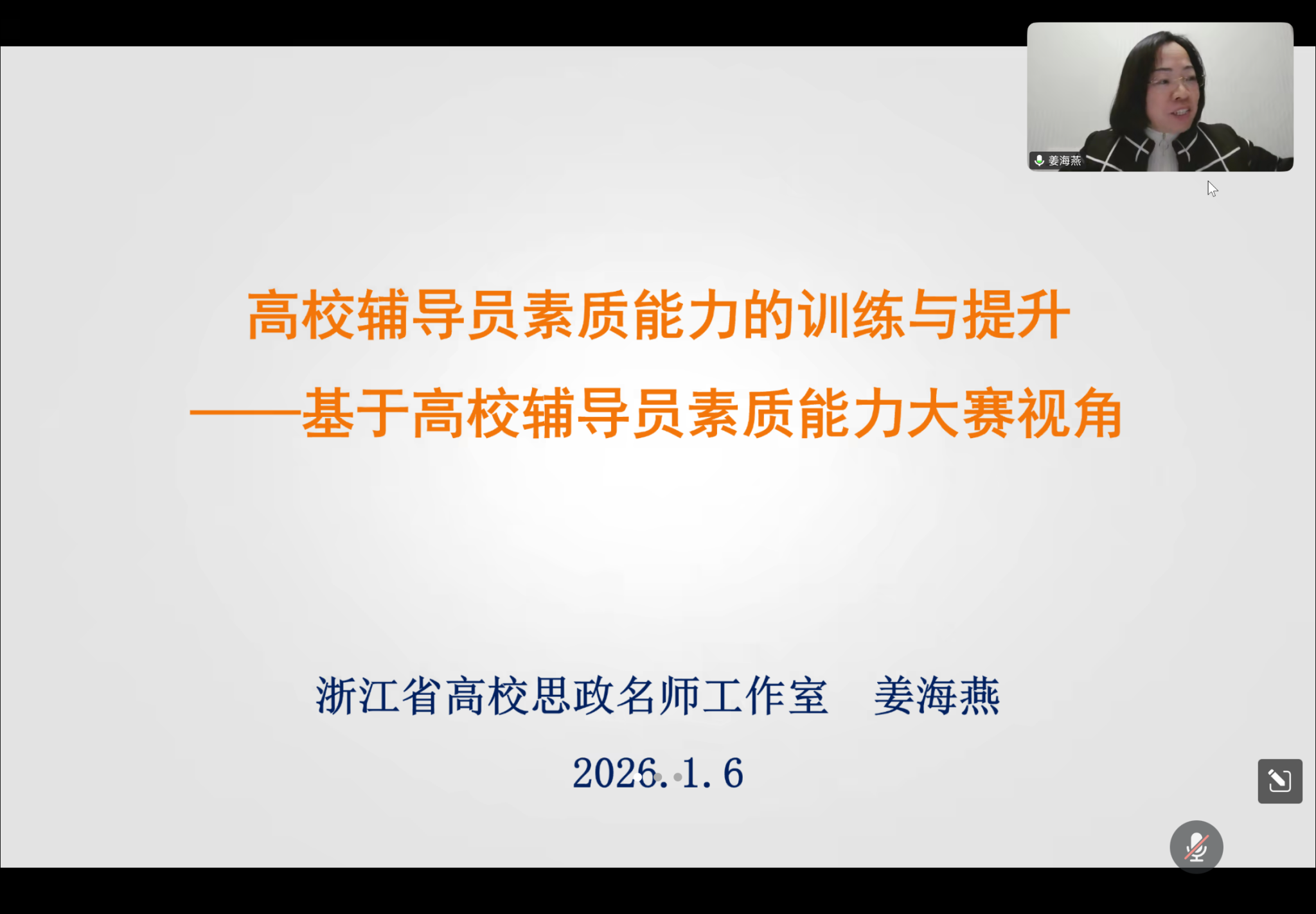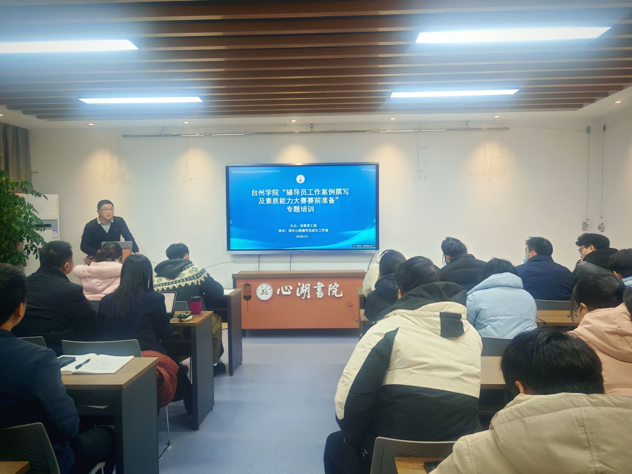 为加强辅导员队伍专业化建设,提升工作案例撰写水平与职业能力素养,1月6日,校党委学工部组织、扬长心路辅导员成长工作室承办的专题培训顺利举行。温州大学党委学工部部长姜海燕受邀以腾讯会议形式作辅导报告,全校各二级学院、台州两所兄弟院校的近 100辅导员代表线上线下同步参会。