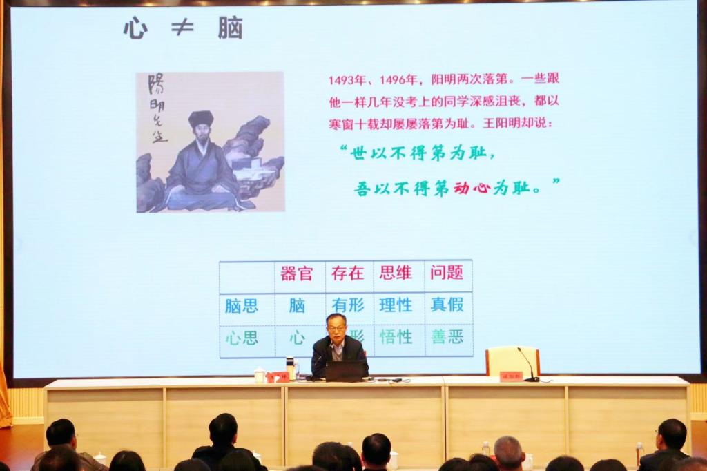 随后,王教授将话题聚焦于阳明心学,详细阐述了“心学”在大学教育中的重要作用。他指出,心既不是心脏也不是心理,而是承载生命的主体,是生命活动的主宰,更是精神生命的本体。在此基础上,他进一步探讨了安心立命和安心立民这两个核心议题。安心立命,即要人们发现并认可自己内心的本性,并保持这种本性,这是政德修养的内圣修养;而安心立民,则是政德修养的外王修养,要求人们牢记使命,不忘初心,为社会和谐美好贡献自己的力量。讲座中,王希坤教授不仅深入浅出地解析了心学的深奥哲理,还以生动的案例和独到的见解,为听众们带来了知识与思想的双重盛宴。讲座内容既通俗易懂,又内涵深刻,赢得了在场听众的阵阵掌声。