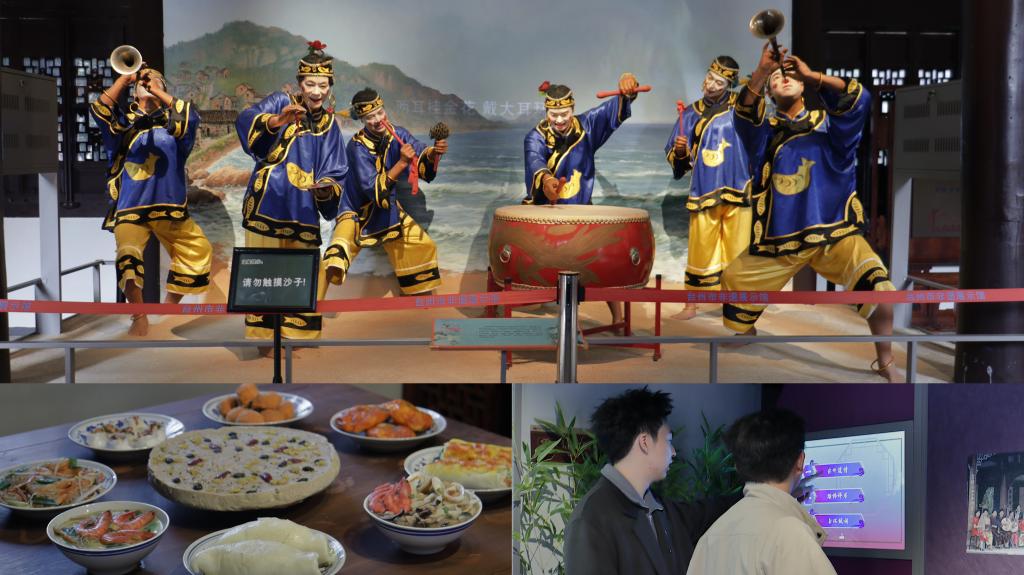 在非遗展示馆内,学子们依次参观了台绣、黄沙狮子、仙居花灯、黄岩翻簧竹雕及台州特色美食展区。台绣展区以“雕平绣”技艺为核心,一幅幅繁复精美的刺绣作品令学子们驻足端详;黄沙狮子展区通过动态模型,生动还原了传统武术与舞蹈相融的雄浑气韵;仙居花灯则以“针刺无骨”的绝妙工艺,让众人惊叹于古法匠心的巧夺天工;黄岩翻簧竹雕展区则以其纤毫毕现的雕刻技艺,展现了竹艺文化的隽永风骨。移步美食展区,姜汤面、嵌糕、食筒饼等特色小吃香气氤氲,学子们在味蕾的跃动中感受台州饮食文化的独特魅力。