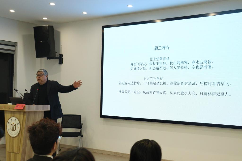 讲座中,洪卫以台州本土故事和诗歌为切入点,深入挖掘三峰寺的历史底蕴,解读了北宋张景修、石公弼的《题三峰寺》等经典诗作。他呼吁同学们探寻文化根脉,从先辈智慧中汲取精神滋养,并以紫阳街、东湖与北固山为例,阐释诗歌在抒情言志、史料佐证和文化传播中的价值,使同学们对诗歌内涵有了更深刻的理解。