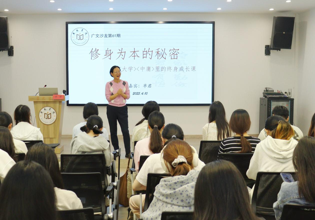 2025年4月10日,广文书院在多功能厅成功举办了以“修身为本的秘密——《大学》《中庸》里的终身课”为主题的沙龙活动。特邀台州市名师,浙江省优秀教师单君担任主讲嘉宾,吸引了众多书院学生积极参与。