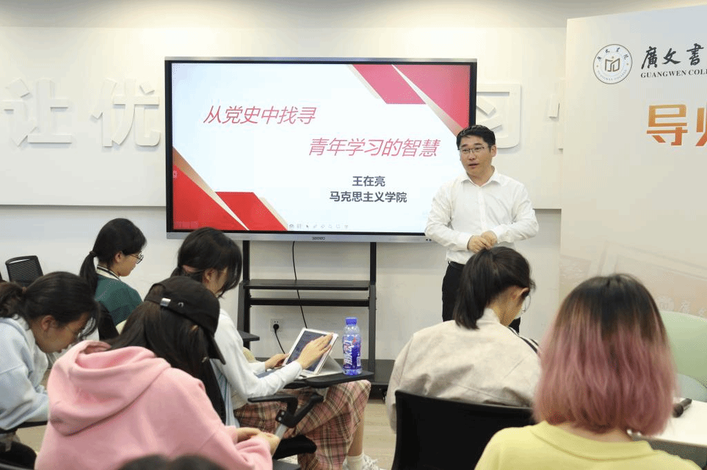 为助力学生有效学习,4月18日晚,导师会客厅活动在广文书院多功能厅顺利举行。本期活动以“从党史中找寻青年学习的智慧”为主题,邀请到了广文书院导师王在亮为学子们带来了一场精彩纷呈的分享。