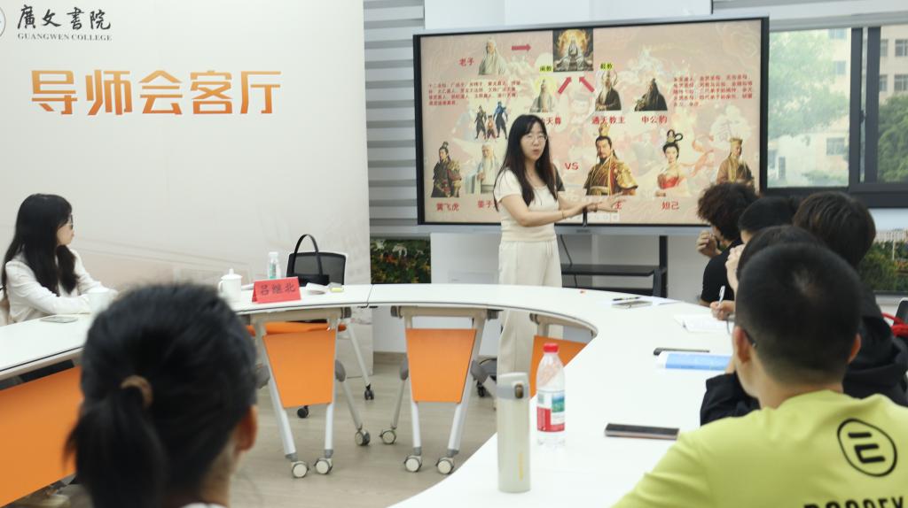 5 月 8 日晚,广文书院在多功能厅成功举办了第 5 期广文悦读活动。本期活动以“古典文学的现代演绎”为主题,特别邀请人文学院专任老师、书院导师吕继北作为主讲嘉宾,与书院学子共同品读经典名著《封神演义》,深入探讨流行文化对古典文学的传承与创新之路。