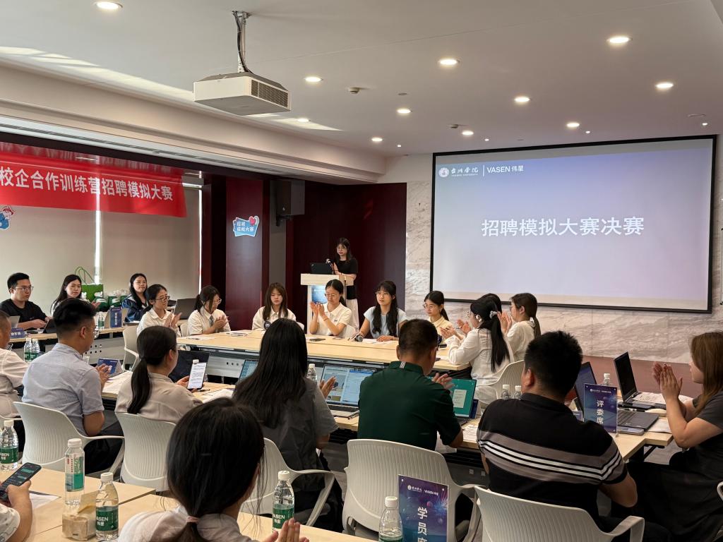 本次大赛面向台州学院全体学生及伟星新材“星创客”学员开放,设置技术类、营销类、制造类、行政类等十余个模拟岗位,涵盖材料科学、机械工程、人力资源、新闻传播、英语等多个专业领域。参赛学生可根据自身专业与兴趣选择岗位,体验从简历投递到多轮面试的全流程挑战。初赛环节19位参赛者进行4分钟的PPT自我展示,并完成情景模拟问答,重点考察表达能力与应变能力。9位选手晋级决赛环节,选手们通过无领导小组讨论形式展开角逐,围绕“谁是捷迅汽车配件集团总经理的最终人选”展开自由陈述和激烈讨论,最后达成一致意见。评委从团队协作、逻辑思维、问题解决等维度综合评分。最后药学院叶薇同学荣获一等奖。