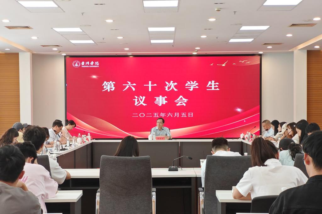 2025年6月5日,校第60次学生议事会在椒江校区第二会议室召开。校党委副书记项凤日出席并讲话,学工部、教务处、团委、信息中心负责人以及两校区学生议事会常任代表共计60余人参加会议。