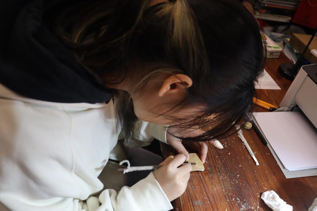 体验环节中,罗文驰现场演示“以刀代笔”的雕刻技法,强调运刀的轻重缓急直接影响作品神韵。他手持刻刀在竹簧上勾勒山水轮廓,纤毫毕现的技艺令同学们赞叹不已。在其指导下,同学们从握刀、运刀学起,专注完成简易竹雕作品,沉浸式感受传统工艺的魅力。交流中,大家围绕技艺传承与创新设计踊跃提问,罗文驰一一作答,并分享自己“让传统被看见”的坚守初心。