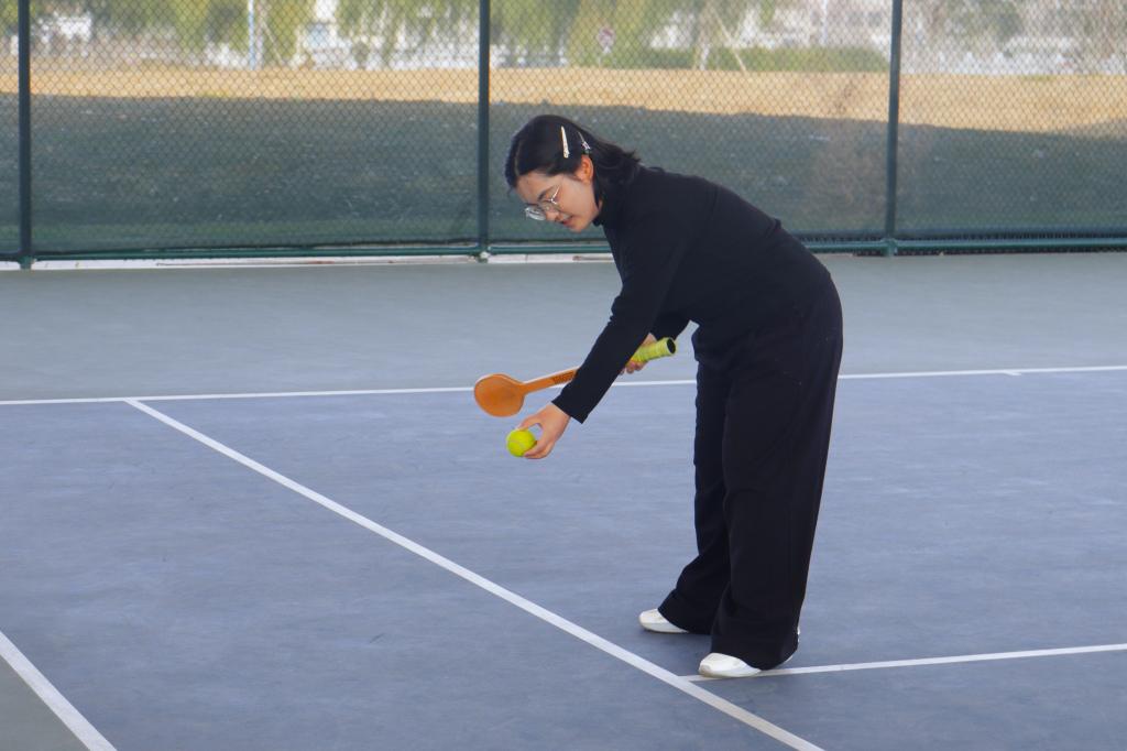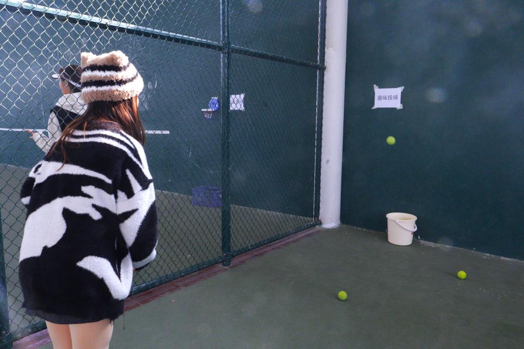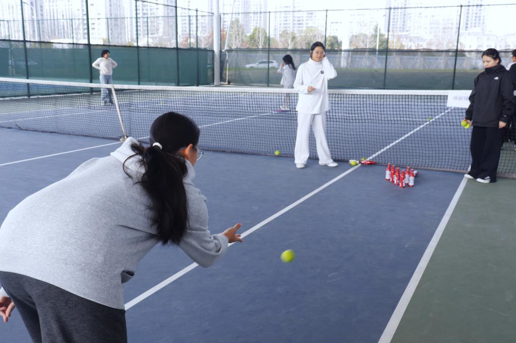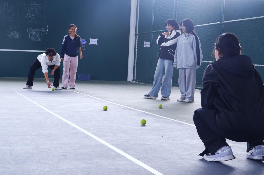 活动采用积分制竞赛形式,精心设置了多个兼具趣味性与挑战性的特色项目。“百发百中”环节,同学们瞄准篮筐精准投球;“一发入魂”项目中,大家挥拍瞄准小球框比拼精准度;“摇摆拾球者”则考验平衡与速度,参与者转圈后迅速捡球的模样引得现场笑声阵阵。此外,“网球冰壶”“趣味投球”“网球保龄球”等创意项目,让不同基础的同学都能找到参与感,现场氛围热烈高涨。