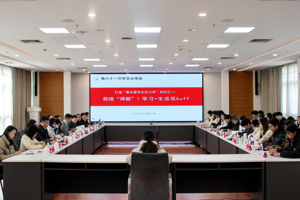 2025年12月25日,校第61次学生议事会在椒江校区行政楼第二会议室顺利举行。校党委副书记项凤日出席会议并讲话,学工部、安保部、教务处、后勤处、信息中心、图书馆等职能部门相关负责人,以及学生议事代表共计40余人参会,共同围绕学生学习与生活相关诉求,凝聚共建共识。