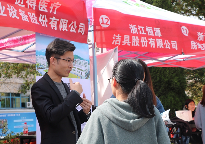 3月23日下午,临海校区学生活动中心大圆盘热闹非凡,台州学院2019届毕业生小型招聘会暨2020届学生实习双选会正如火如荼举行。浙江伟星实业发展股份有限公司、迈德医疗工业设备股份有限公司、宁波市爱凯国际贸易有限公司、宁波亚虎进出口有限公司等28家用人单位参会,提供了外贸业务员、办公室文员、电子商务助理、教育培训等80余个岗位,共需毕业生629人。