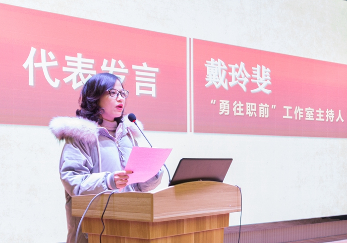 授牌仪式上,张梅芬宣读了《关于设立台州学院首批“辅导员工作室”的通知》。首批设立的辅导员工作室共有5个,分别是李金花主持的“商学商习”辅导员工作室,戴玲斐主持的“勇往职前”辅导员工作室,冯荣主持的“扬长心路”辅导员工作室,高晗雯主持的“明德树人”辅导员工作室,刘贵花主持的“青春守望者”辅导员工作室。辅导员工作室代表戴玲斐进行了表态发言。