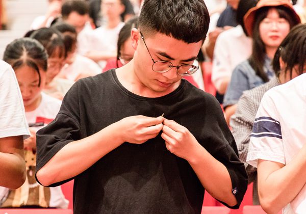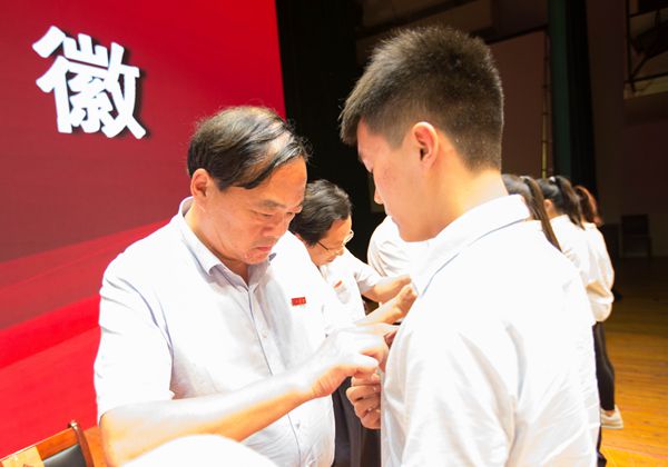 伴随着铿锵有力的校歌声,校领导为2018级新生代表佩戴校徽,其他新生全体起立,为自己佩戴校徽。戴上了沉甸甸的校徽,标志着所有2018级新生正式成为了台州学院的一名学生。