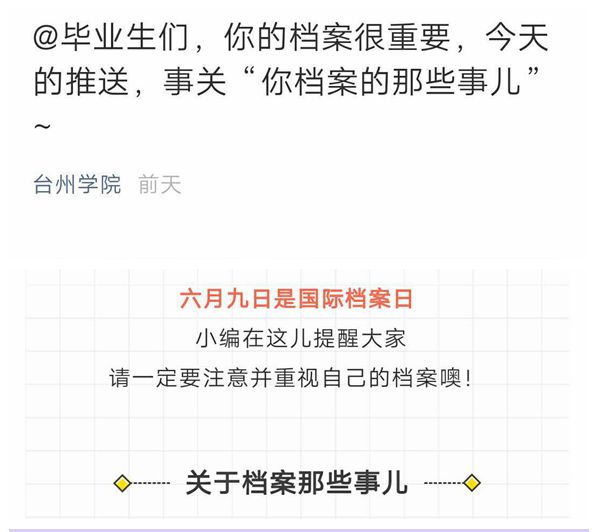 此次档案宣传的知识都是跟学生紧密相关的,比如“毕业证书丢失了怎么办”“报到证干什么用、丢失了如何处理”“档案遗失该去哪里补办”等学生平时关注较多的知识。活动采取“线上线下相结合”的方式在椒江校区和临海校区同时举行,一方面通过张贴海报和散发宣传折页,让尽可能多的同学了解档案知识;另一方面,将档案知识制作成微信推送,发布在台州学院官方微信公众号里,让在外实习见习的学生也能收到信息。