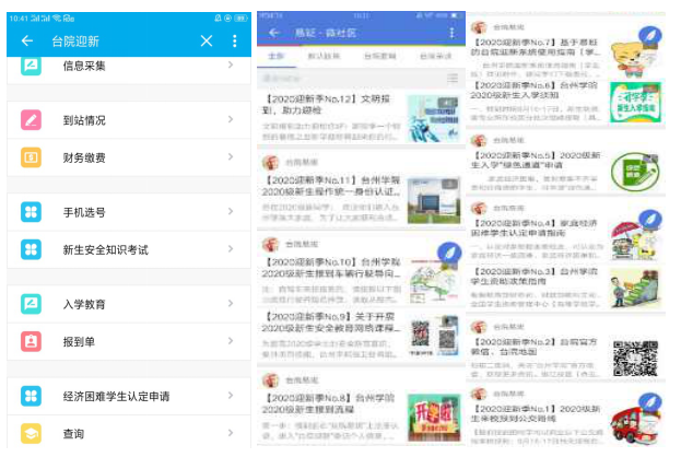 3.制作2020迎新季系列推送。台院易班共制作了12期迎新季推送,内容涉及学校介绍及交通线路、新生入学须知、新生报到流程、迎新系统使用须知、入学“绿色通道”申请、学生资助指南等。推出《文明报到,助力迎检》特别报道,倡导新生和家长文明有序报到。
