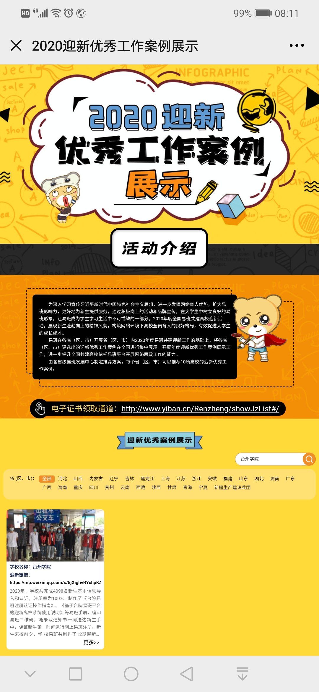 为深入学习宣传习近平新时代中国特色社会主义思想,进一步发挥网络育人优势,扩大易班影响力,更好地为新生提供服务,同时通过积极向上的活动和品牌宣传,在大学生中树立良好的易班形象,进一步提升全国共建高校依托易班平台开展网络思政工作的能力,教育部易班发展中心在各省(区、市)1682所高校中开展2020年度易班共建迎新工作的基础上,将各省(区、市)组织评选推荐的168个迎新优秀工作案例在全国进行集中展示,我校易班迎新工作入选2020年度全国易班共建高校迎新优秀工作案例。