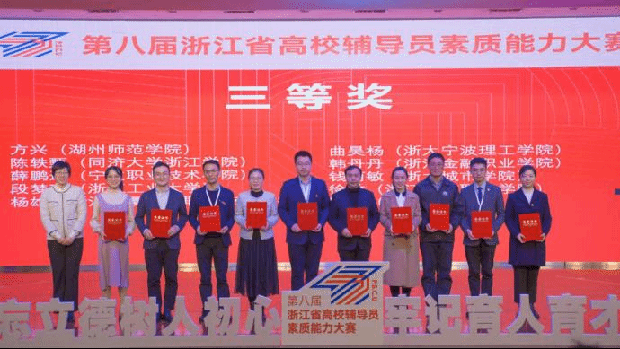 12月1日至3日,第八届浙江省高校辅导员素质能力大赛在浙江师范大学举行,我校辅导员陶媛老师身怀六甲,仍积极备赛,最终荣获三等奖。
