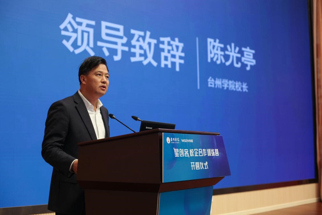 校长陈光亭为开营仪式致辞,他表示,台州学院与伟星新材曾有过多次愉快的合作。本次“星创客”校企合作训练营是提升学生职场竞争力,提前体验职场的有效方法,同时对学员们提出几点要求,期望学员们能够博学审问、慎思明辨、务实笃行,在“星创客”训练营这个平台中锻炼提高。