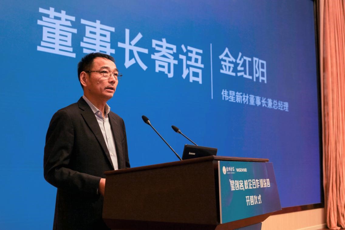 伟星新材董事长金红阳寄语新学员,他回顾了伟星新材与台州学院多年来的合作历程,许多台院人凝聚在伟星,他们凭着自己的激情与奋斗成为公司的中坚力量。他表示,“伟星梦”的实现需要更多的有理想、有志向、有作为的年轻人。他期望学员们在“星创客”训练营中能够学有所获,实现个人的创新、创业、创未来。