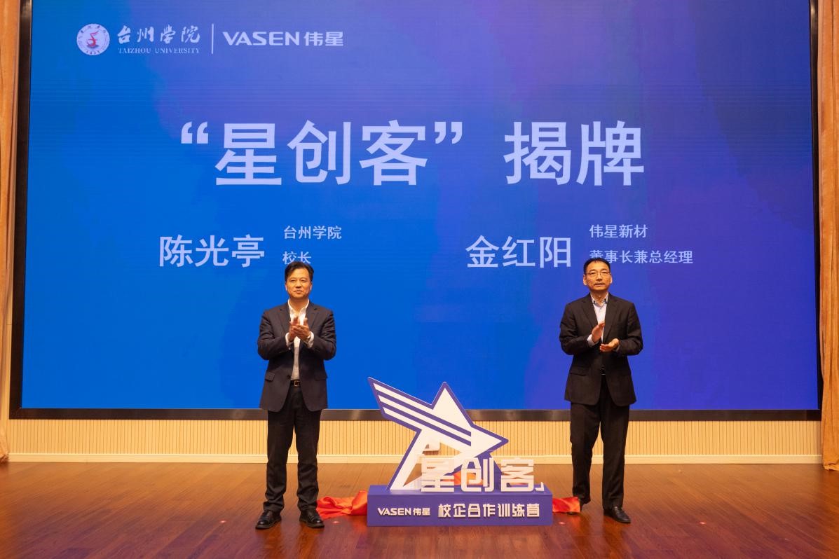 此次训练营还在伟星新材中层干部中聘请了9位导师,并举行了拜师仪式,学员向导师递交拜师贴,导师为学员佩戴学员证。校党委副书记金先龙与伟星新材总经理助理郑敏君为学员代表授徽章。仪式最后,校长陈光亭、伟星新材董事长金红阳为“星创客”训练营项目揭牌,宣告项目的正式启动,也代表着校企合作的再一次升级。