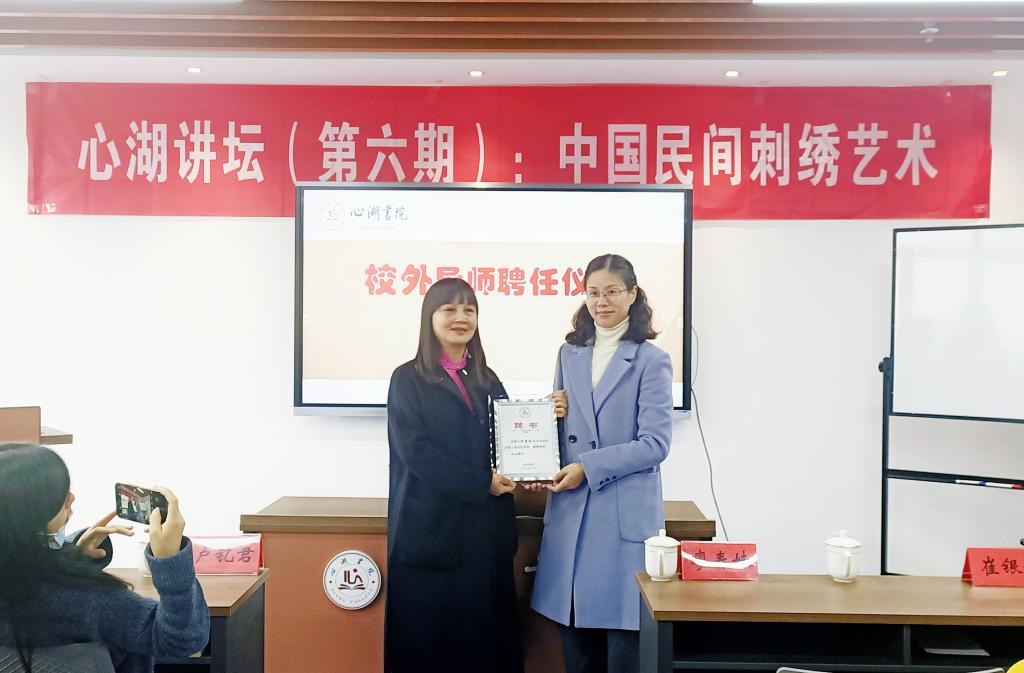 11月28日上午,国家高级工艺美术师、首届中国刺绣艺术大师廖春妹应邀为心湖书院作题为《中国民间刺绣艺术》的主题讲座。校党委学工部副部长王林军主持,心湖书院副院长刘贵花及书院学员共同参加。