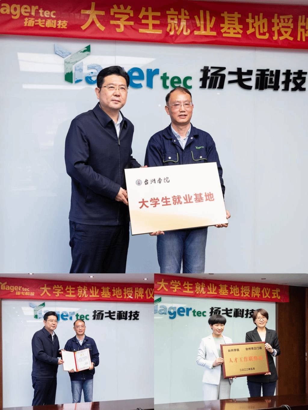 座谈会上,还举行了三门县—台州学院人才工作联络站、台州学院大学生就业基地授牌仪式,聘请了扬戈科技总经理汤聿波为台州学院就业导师。走访组一行还参观了公司的展厅和检测中心。