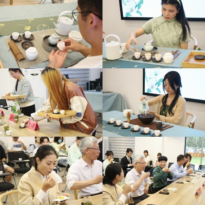 茶艺展示环节。第一组学员展示普洱茶壶泡法,从醒茶、投茶到奉茶,茶香自然醇厚,入口回甘持久不散,满口芳香;第二组学员展示乌龙茶冲泡法,从温杯烫具、冲泡到奉茶,茶香浓郁,入口甘甜,回味无穷;第三、四组展示红茶盖碗冲泡法,从投茶、注水到奉茶,茶香厚实香浓,滋味醇厚,口感极佳;第五、六、七组学员展示冰清玉洁玻璃杯冲泡法,从净杯、养汤到奉茶,茶香清新雅致,茶味清爽鲜美,滋味别样;最后由学员何燕展示点茶法,学员刘高越作为副泡奉,从洗尘、过滤到奉茶,茶味细腻,回味甘甜。各组学员在此次茶会中,将自己的所见所学展现得淋漓尽致,在举手投足间流露出沏茶的优雅与魅力,展示了我国灿烂的茶文化。