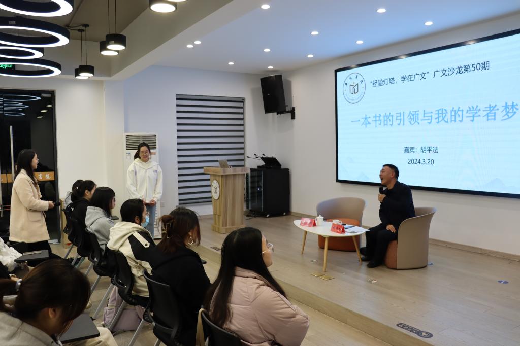 3月20日晚,广文书院在多功能厅举办了以“一本书的引领与我的学者梦”为主题的沙龙活动,邀请了“台州市藏书状元”胡平法担任主讲嘉宾,部分书院学生参加活动。