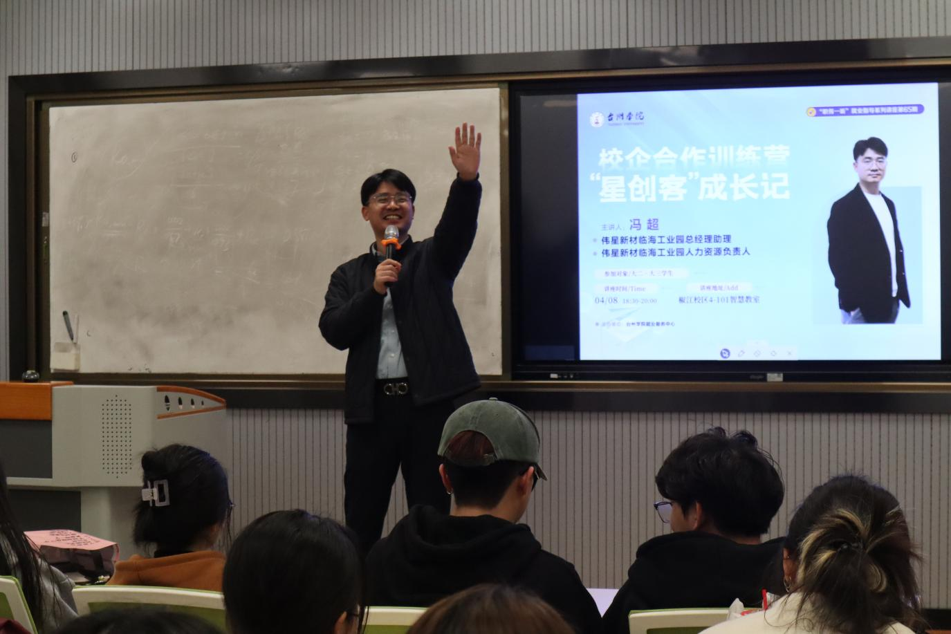 4月8日晚,我校第65期“职”得一听就业指导讲座在椒江校区智慧教室4101举行。浙江伟星新型建材股份有限公司临海工业园总经理助理冯超应邀作“校企合作训练营‘星创客’成长记”的主题讲座,30多位学生参加。