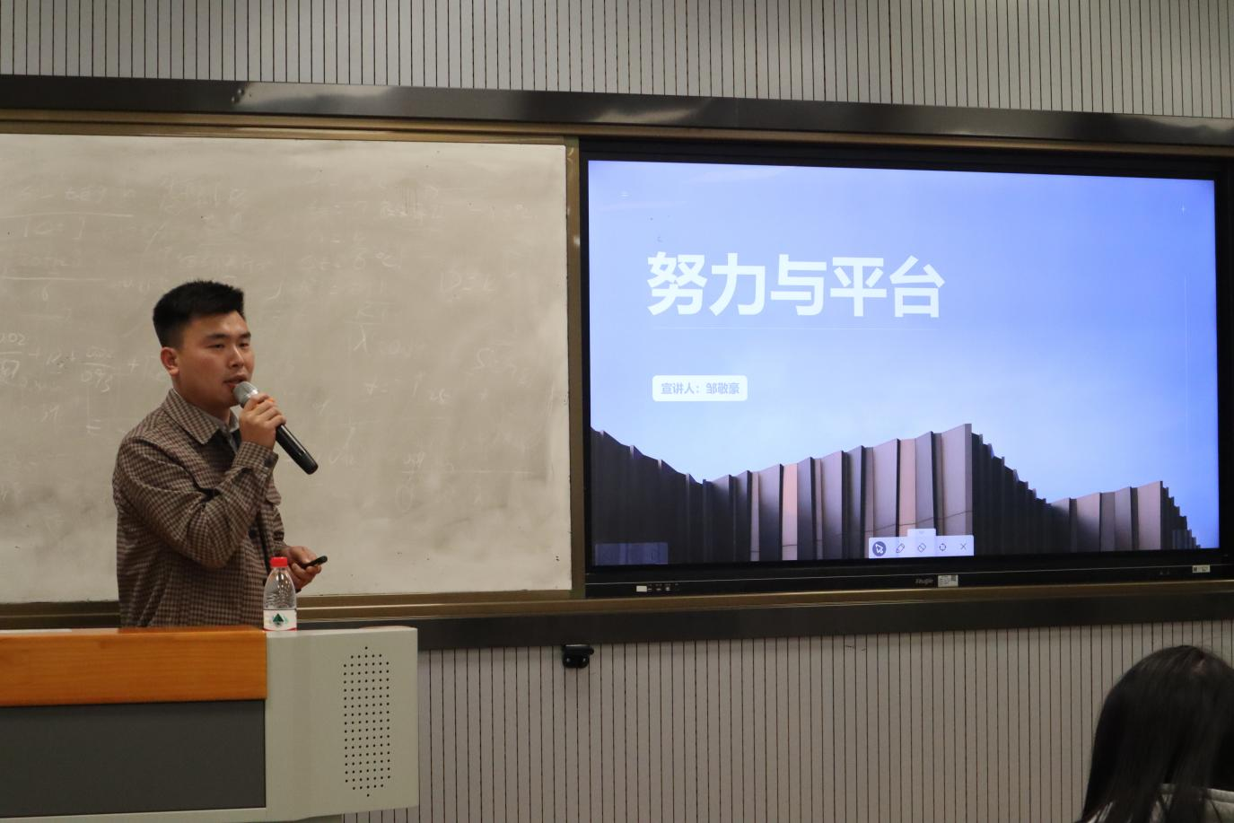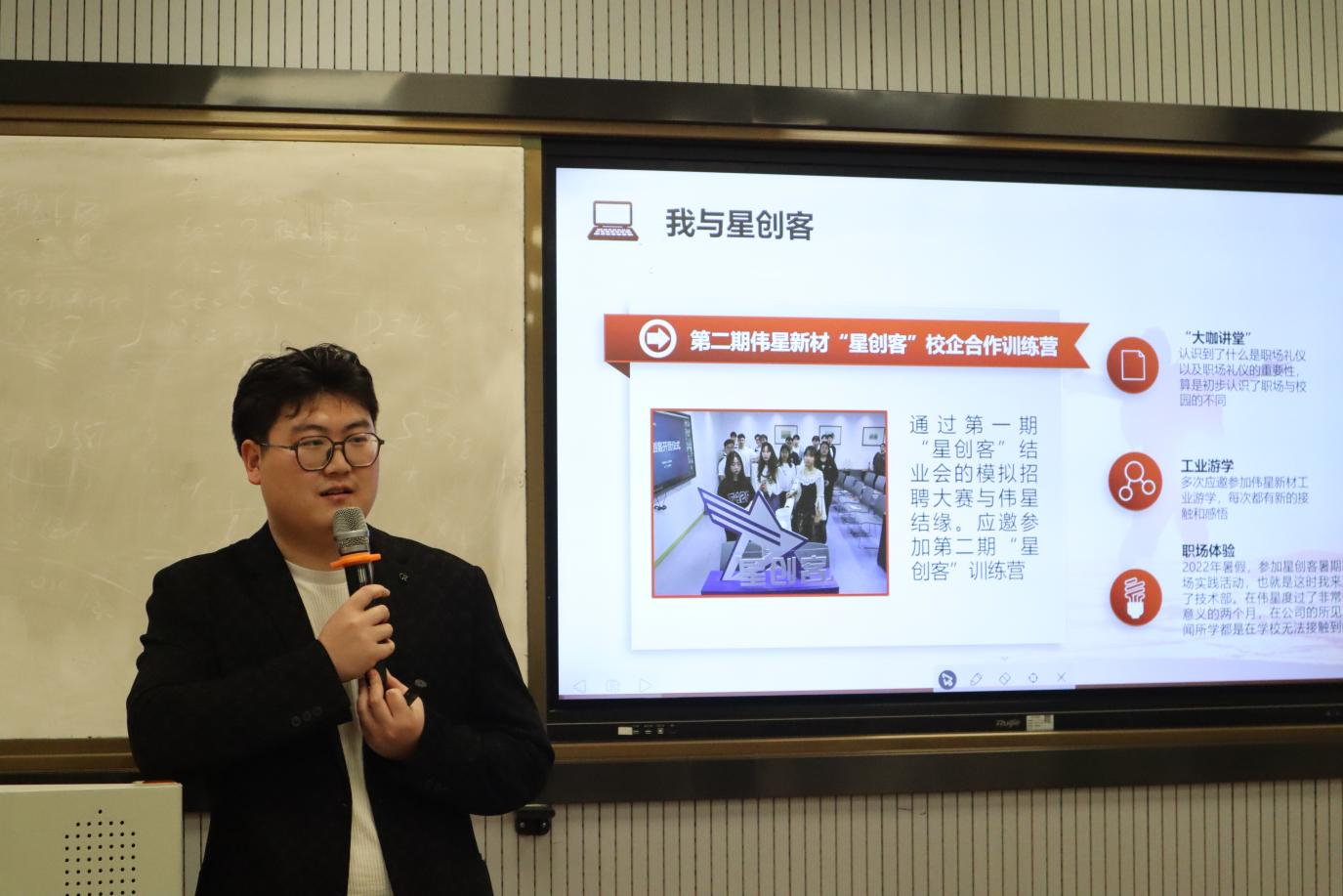 在伟星新材工作的邹敬豪、陈钰坤两位学长以自身工作经历为例,详细介绍了“工业游学”“大咖带教”“行业峰会”“项目历练”等“星创客”品牌活动。当同学们对行业不熟悉,对企业知之甚少的时候,希望大家抓住机会,从这一个实践活动辐射到全面的职业生涯规划。
