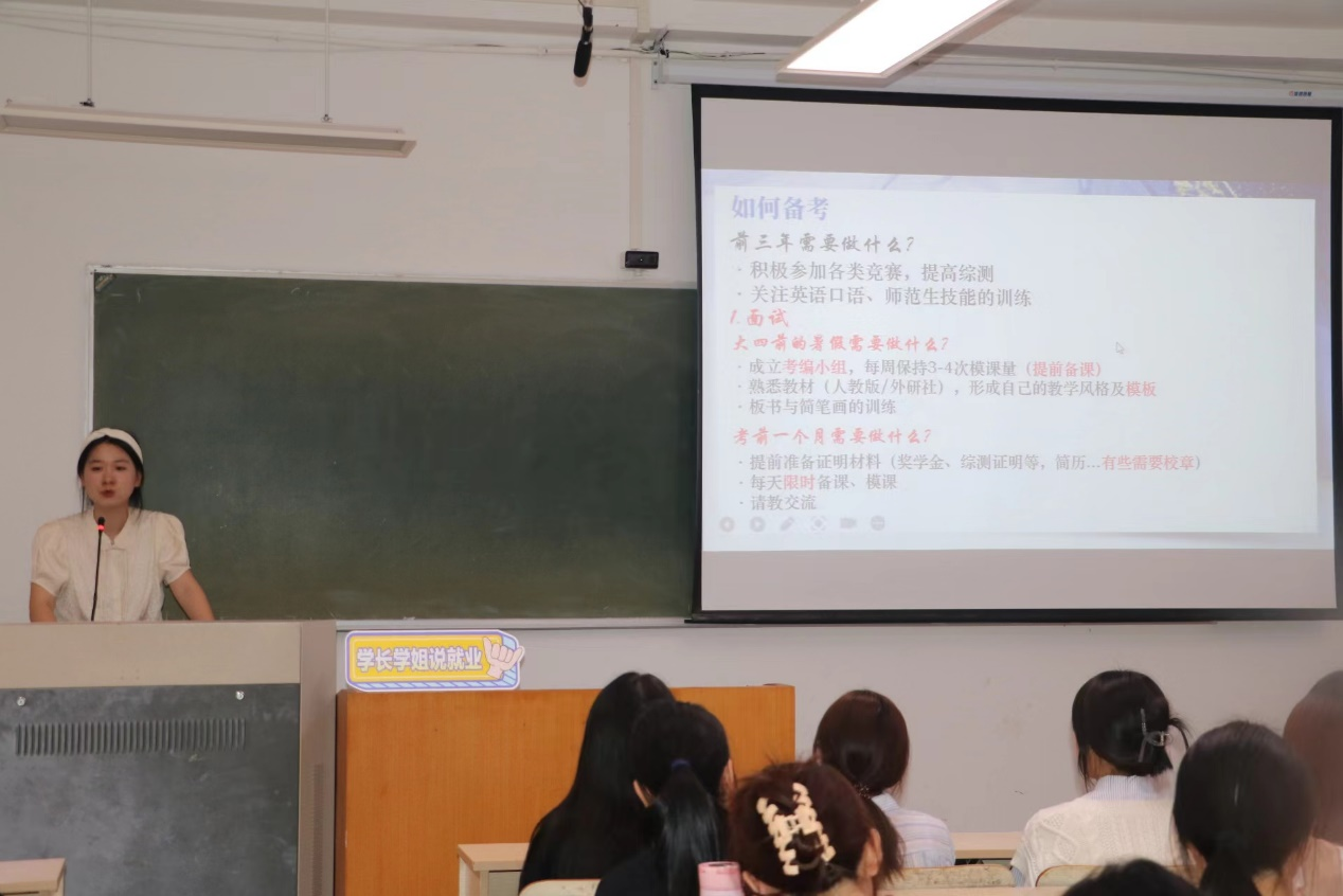 徐梦玲以“保持热爱,奔赴山海”为主题,结合自己通过台州玉环地区中学英语编制考试的经历,分析了台州市内各区县提前批考试的需求,讲解了考编的招聘流程和每一步需要准备的材料,并给同学们推荐了适合备考的公众号以及教辅资料。接着徐梦玲学姐以“备考”“应考”两方面作为重点具体展开,鼓励同学们认真准备面试与笔试,并提供了在模拟讲课中突出自己表现的小技巧,比如自信、时间分配、课堂用语、评价体系、课堂真实性等。除应考准备之外,她还鼓励同学们积极参与各项赛事,努力提高自己的综测成绩,关注师范生技能的训练等。