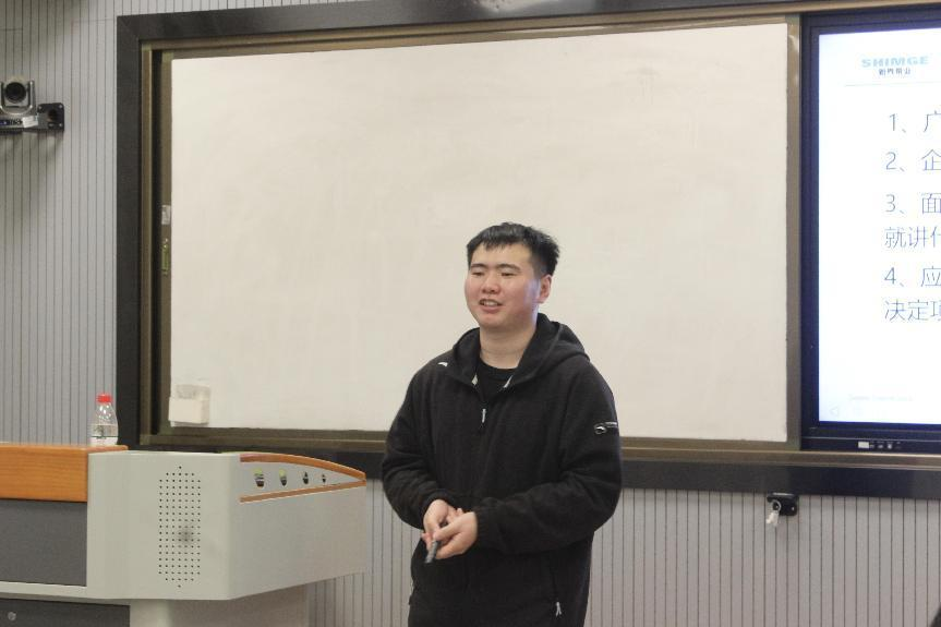 余峻腾以“泵发青春,制造未来”为主题,介绍了自己大学四年的规划、学习方法等,分享了“三维数字化大赛”的比赛经验,鼓励同学们多多参与竞赛。紧接着余峻腾讲述了进入企业一年的工作经历,跟大家分享了“面试技巧”“人际交往”、“自我提升”等方面的经验,最后同学们向余峻腾学长提出了许多问题,如工作体验,薪资待遇等,学长与现场同学耐心交流。