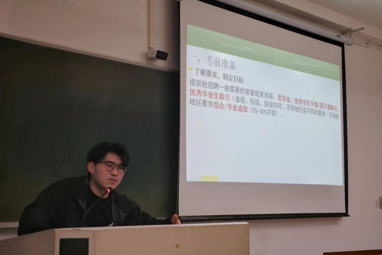 郑泽羿学长以“循梦而行,向阳而生”为主题,介绍了教师编制考试提前批与统招的形式,详细指出制定目标时要了解地区优劣势、明确奖项需求等招聘情况,并结合自己考编经历,提醒同学们提前做好准备。接着从考前分析、着手准备、心态调整三个方面跟同学们分享了考编经验,比如目标制定策略、优秀网站资源获取途径、如何制作一份好简历等。