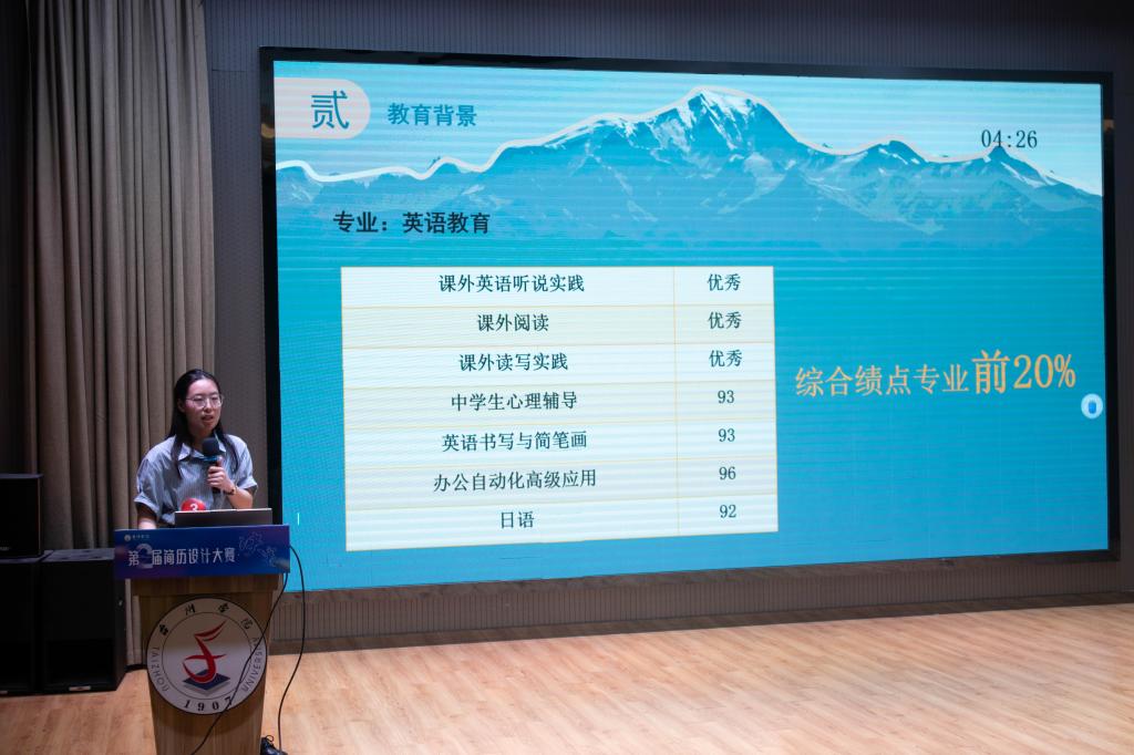 简历设计大赛共有10名选手进入决赛。选手们通过PPT向大家展示了其基本信息、求职意向、教育背景、个人技能及所获奖项、实习经历等情况,他们自信开朗、落落大方。