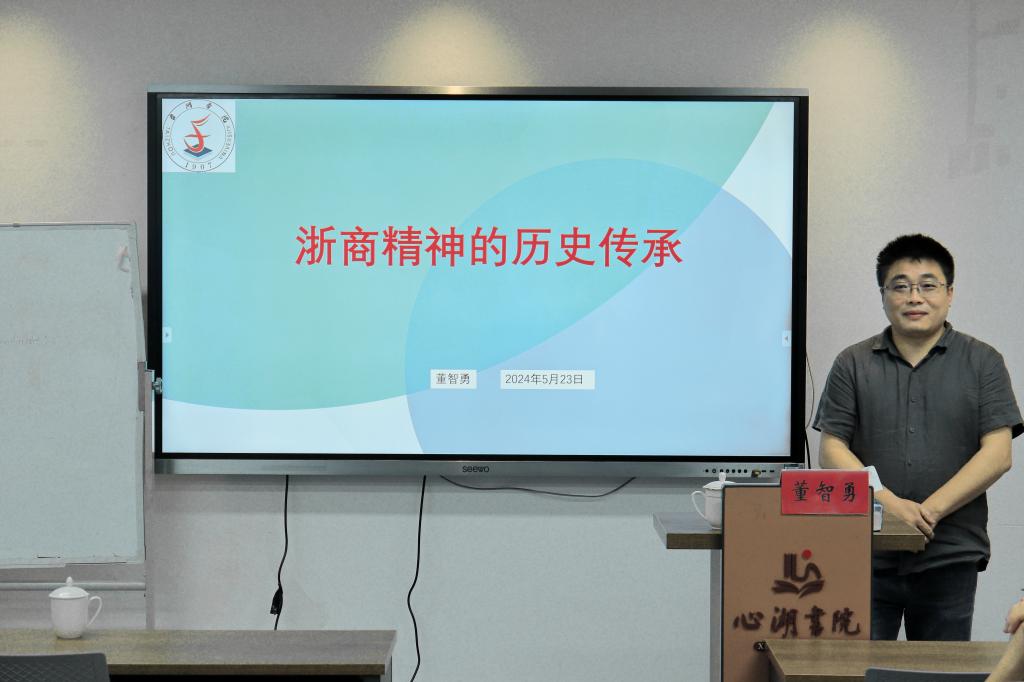 5月23日晚上,第27期心湖讲坛在心湖书院多功能活动室举行,特邀商学院副教授、台州市经济发展研究院院长董智勇老师作题为“浙商精神的历史传承”的主题讲座。心湖书院院长杜才平、副院长陶媛及30余位心湖学子聆听报告。