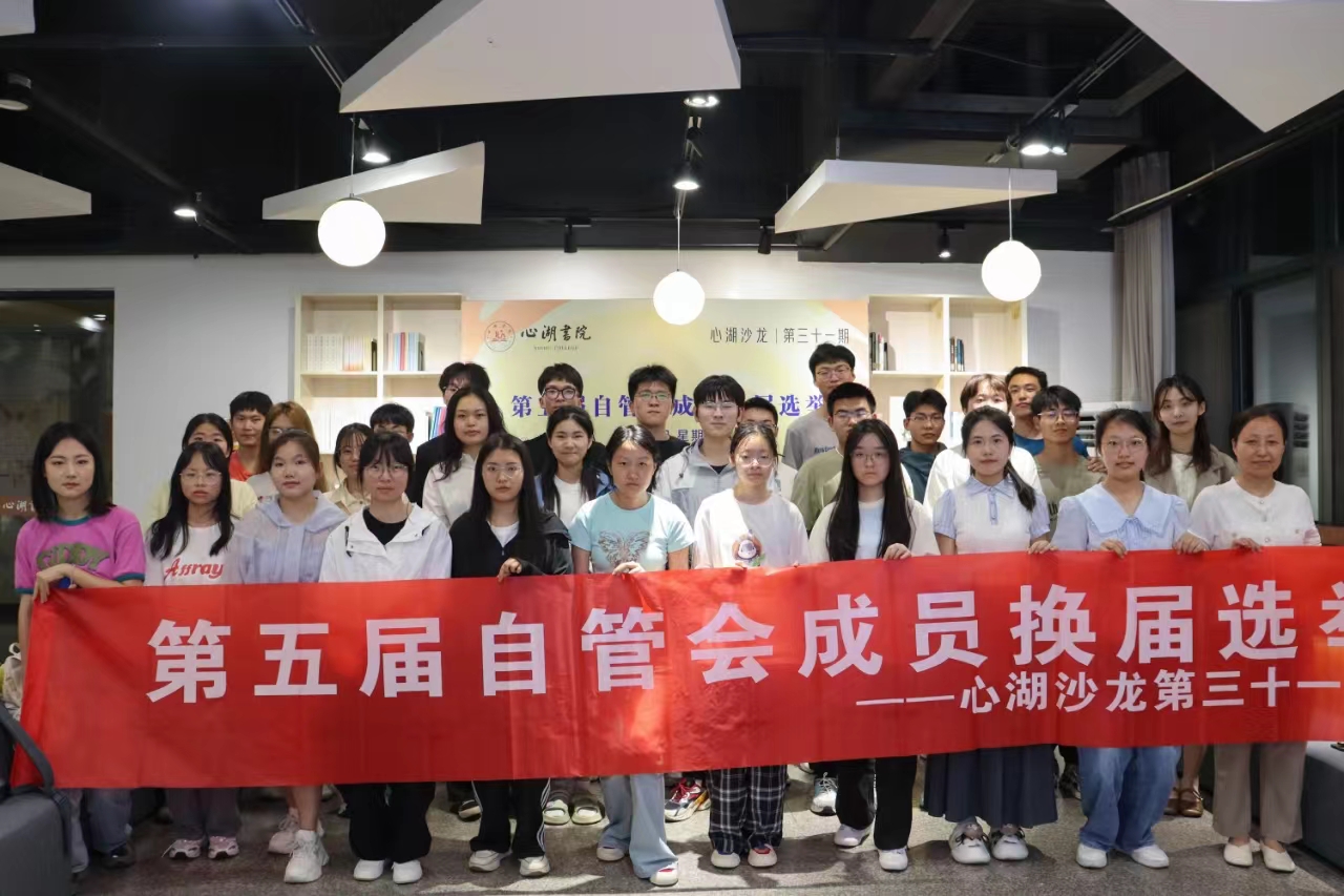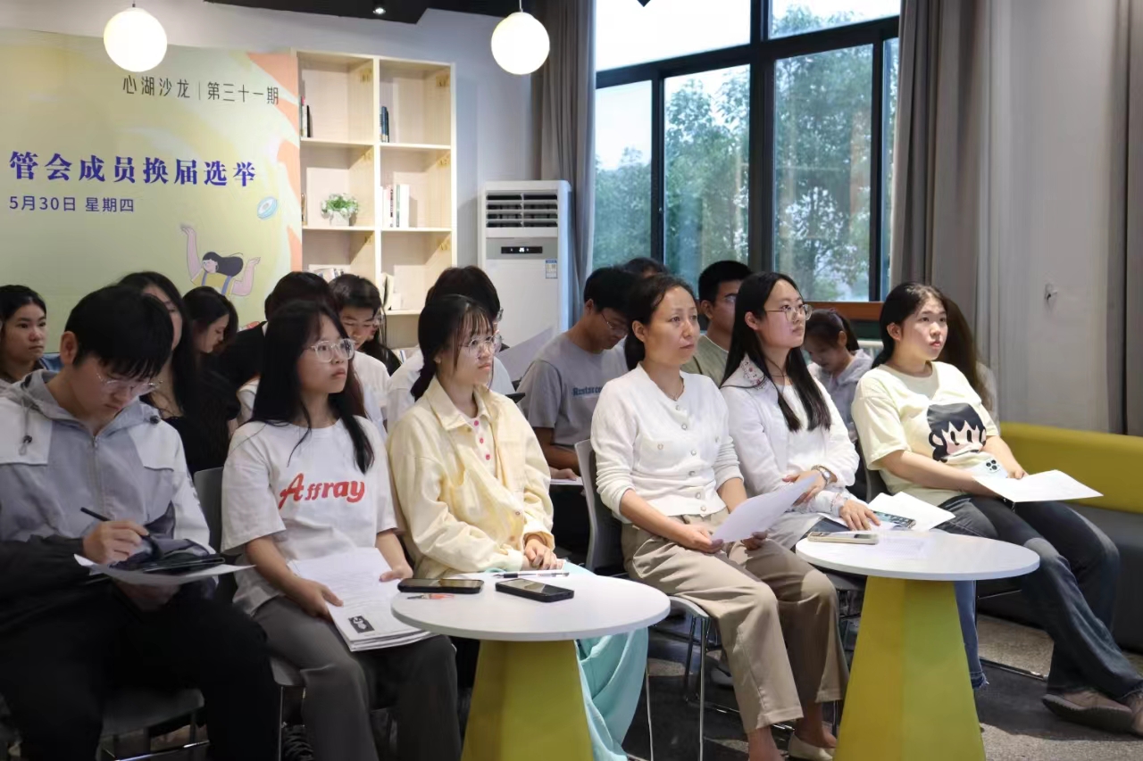 为促进心湖书院自管会的有机更新,更好地推进书院工作的持续发展,5月30日晚,心湖沙龙第三十一期——第五届自管会成员换届选举会议在心湖书院大厅举行。心湖书院辅导员李凌及书院自管会全体成员参加,自管会执行主席杨菱之主持会议。