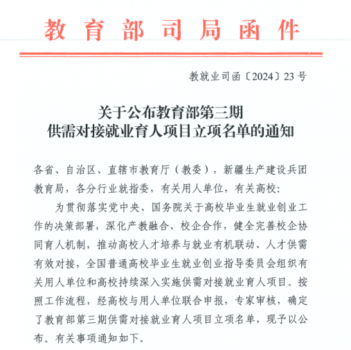 近日,教育部发布了《关于公布教育部第三期供需对接就业育人项目立项名单的通知》(教就业司函〔2024〕23号),我校与吉利控股集团、华海药业、泰隆商业银行等用人单位对接的7个项目获批立项。