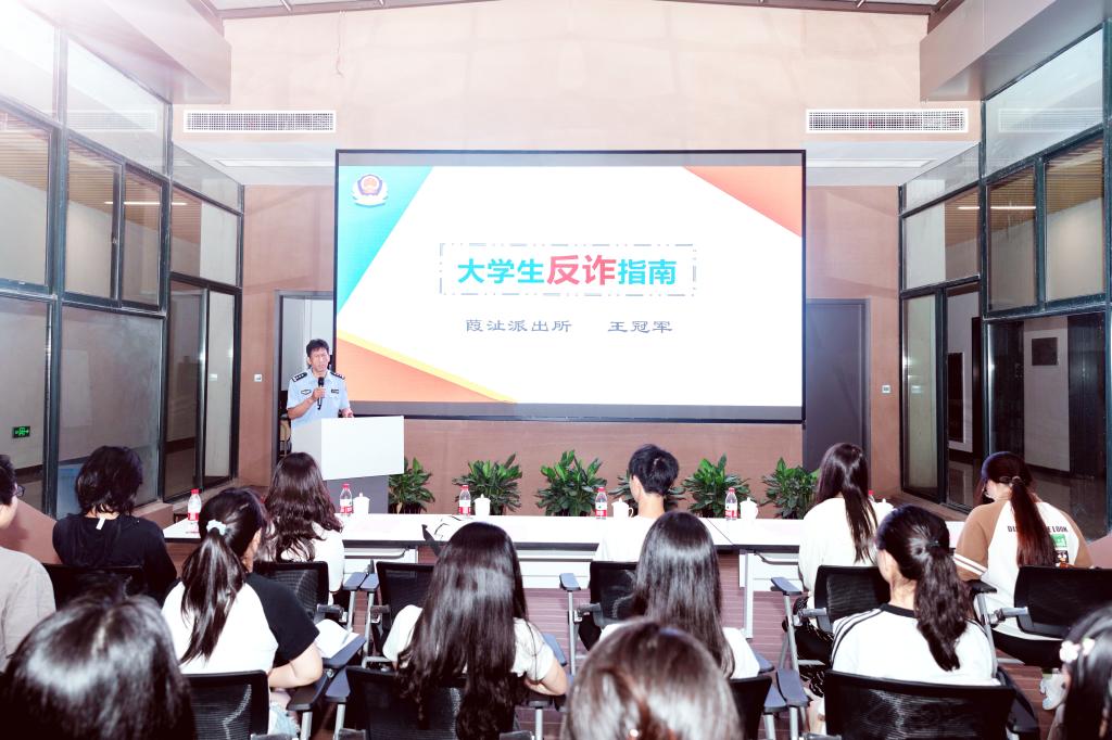聘任仪式上,项凤日为王冠军颁发“校外法治辅导员”聘书。仪式结束后,王冠军为我校商学院学生作首场讲座——《大学生反诈指南》。