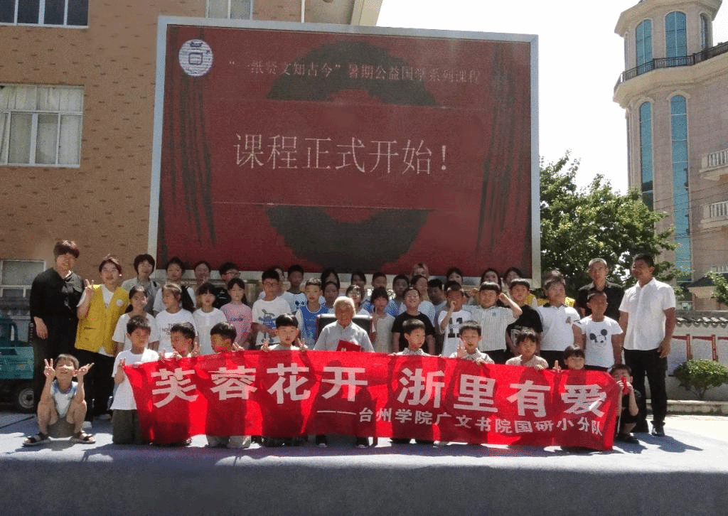 7月7日上午,广文国研小分队在桃渚镇芙蓉村举行“一纸贤文知古今”暑期公益国学系列课程的开班仪式。本次活动由台州学院广文书院与桃渚镇芙蓉村委会及乡贤联谊会联合举办。芙蓉村村委副主任黄元叶、乡贤会执行副会长黄建华、芙蓉村村民委员黄海剑、广文书院副院长金旭球、实践队指导老师赵建芳应邀出席。